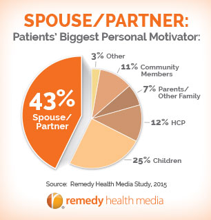 We need to be better and smarter about how we are keeping patients adherent (remember only 25% of patients are adherent). We cannot only be thinking tactics. The reality is, keeping a patient adherent requires much, much more. To keep a patient adherent to their treatment, we need to be their partner and support them, and also look at the key motivators in a patient?s life: spouse, parent, child, sibling, boss, friend, HCP, and many more. And who is their biggest personal motivator? It is their spouse or partner as shown a recent study conducted by Remedy Health Media with Princeton Survey Research Associates International (PSRAI). (See related pie chart.) When it comes to healthcare, we rely on the people we are closest to, our support systems, and the people we trust. It truly takes a village to motivate a patient to stay adherent and committed to their health.